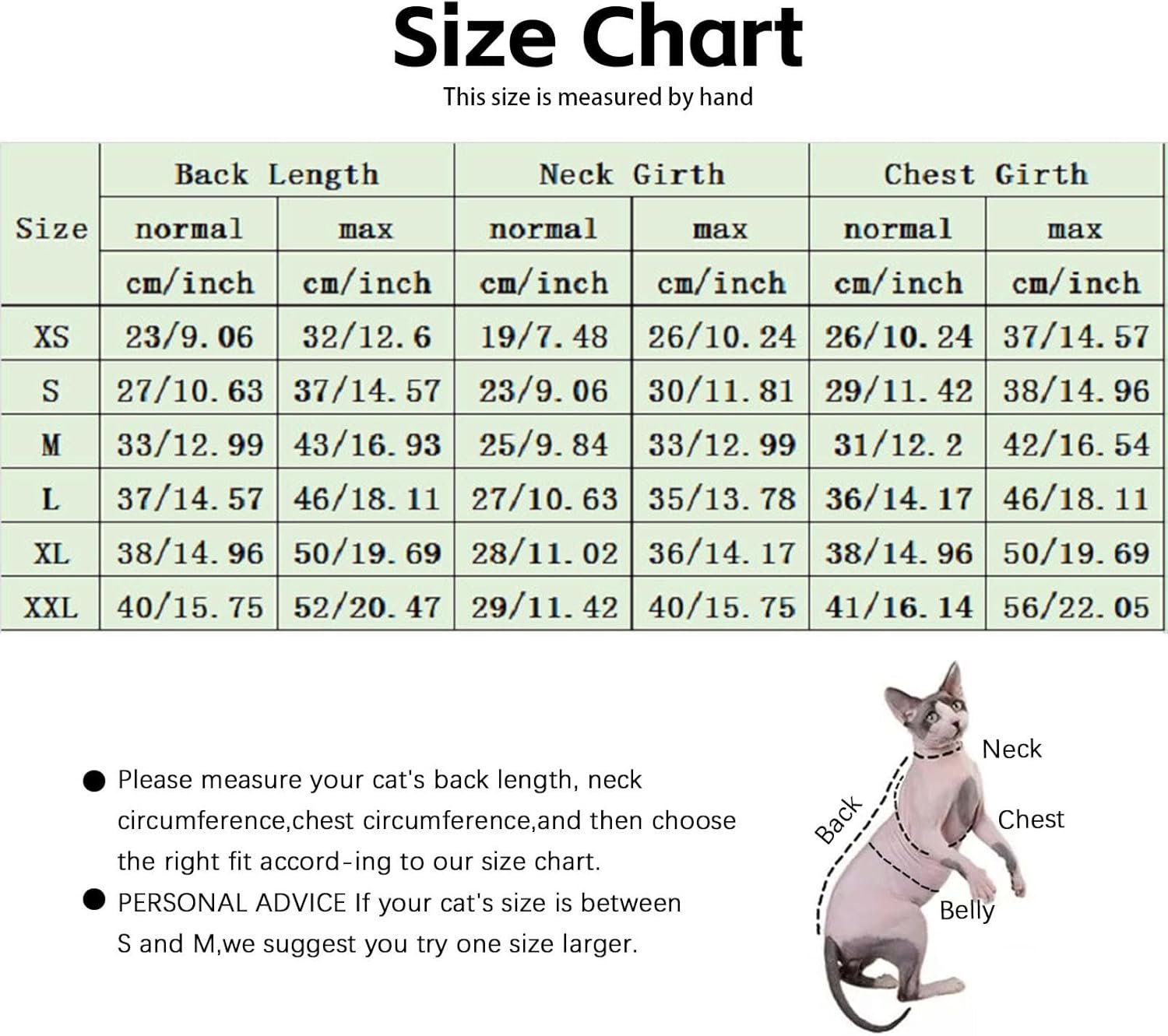 ヒント:注文する前にペットを測定してください。写真にサイズチャートを見つけることができます!適切なサイズを選択するには、猫の首の周囲、胸の円周、背中の長さを測定します