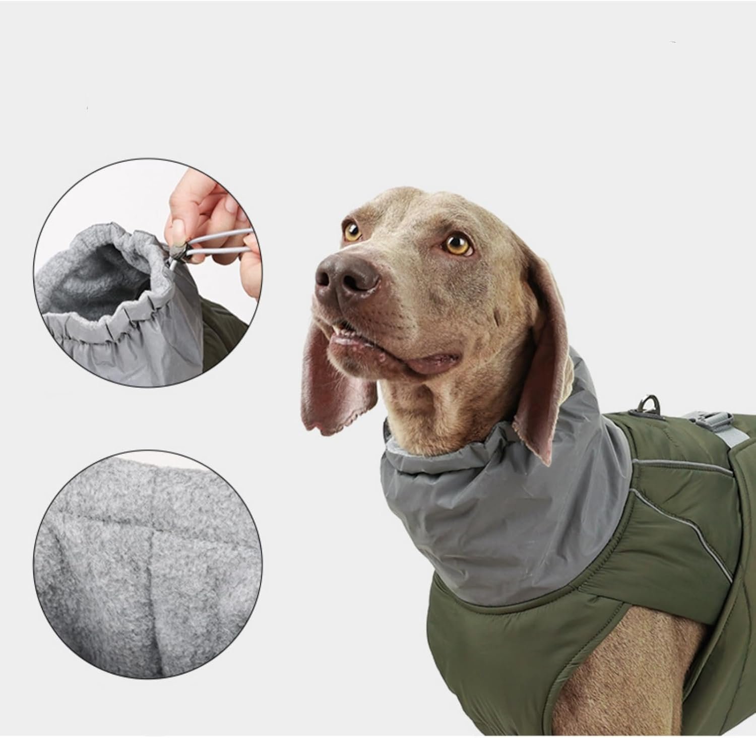 スーパーウォームドッグジャケット:暖かい犬の冬のジャケットは、水の繰り返しナイロンクロスの外側の層とキルティングされた内層で作られています。襟には、風邪をそそる暖かい調整可能なドローストリングが装備されています