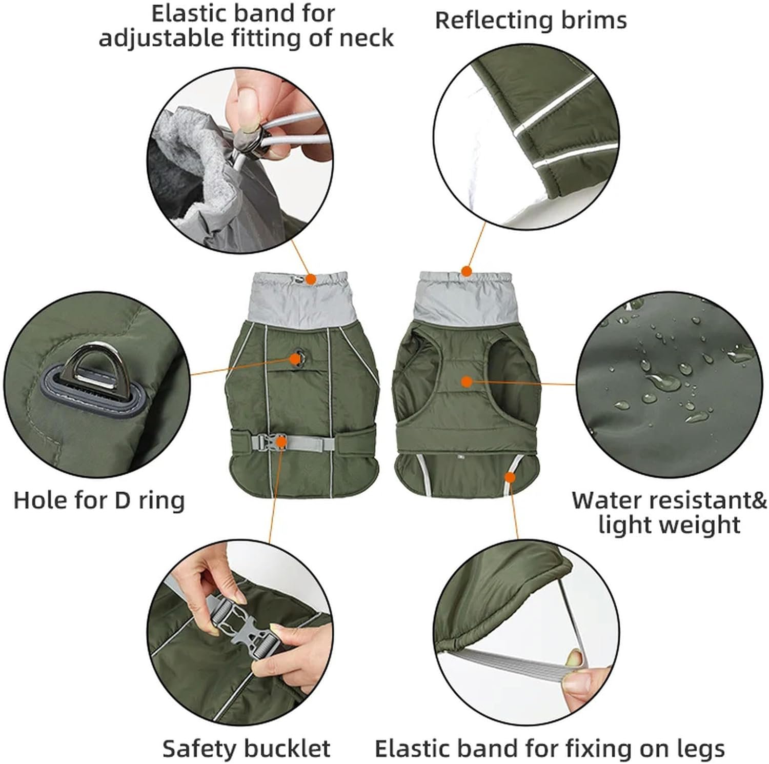 反射 – これらの冬の大きなドッグコートの襟は、夜に犬を見ることができる反射特性で設計されています。背面のループを犬のコードに簡単に取り付けて、犬をコントロールするのに役立ちます