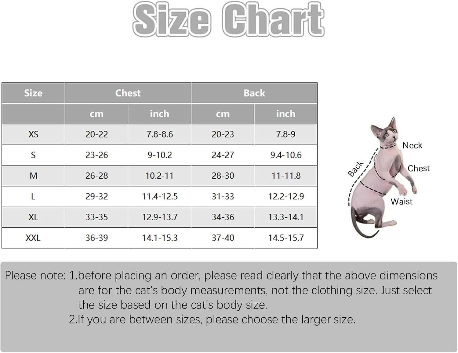 注:この猫のシャツのサイズの基準は、髪のない猫に適していますが、他の猫や小型犬には大きなサイズを選択することをお勧めします。購入する前にペットを測定して、ペットが快適であることを確認してください