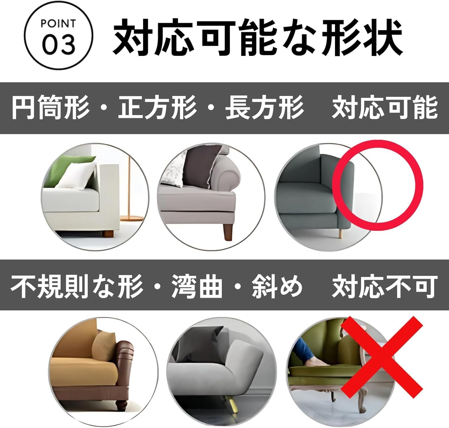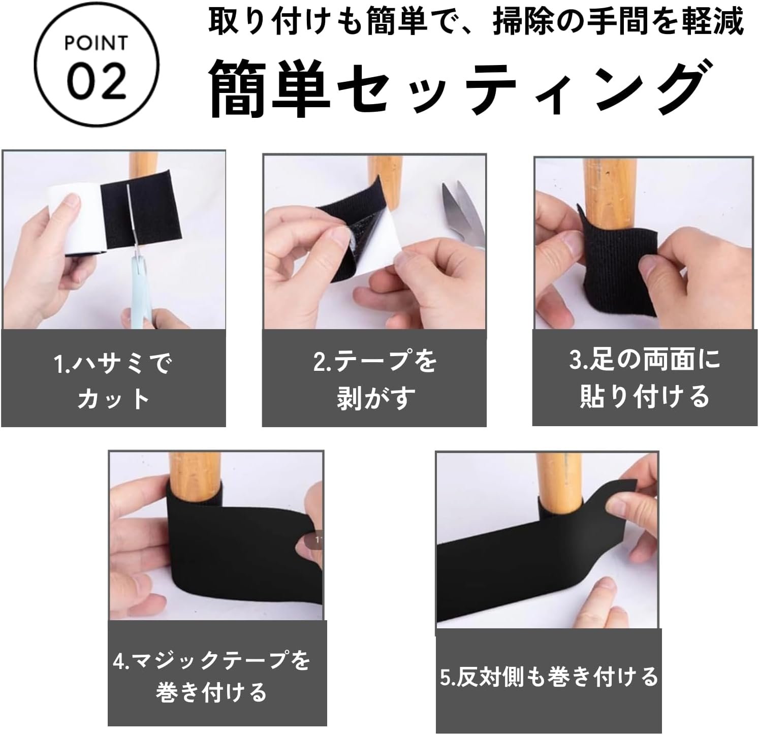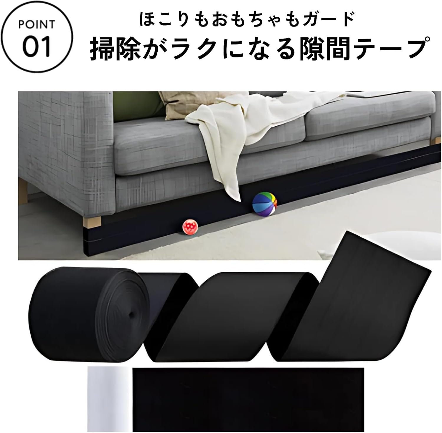 簡単な掃除のためのギャップテープ:ほこりや破片から保護します。家具の隙間に蓄積できるほこりや破片を防ぐことで、部屋を清潔に保つのに役立ちます。取り付けるには、接着テープを家具の脚に取り付けるだけで完了です。また、削除するのも簡単ですので、邪魔にならずに快適な生活を楽しむことができます