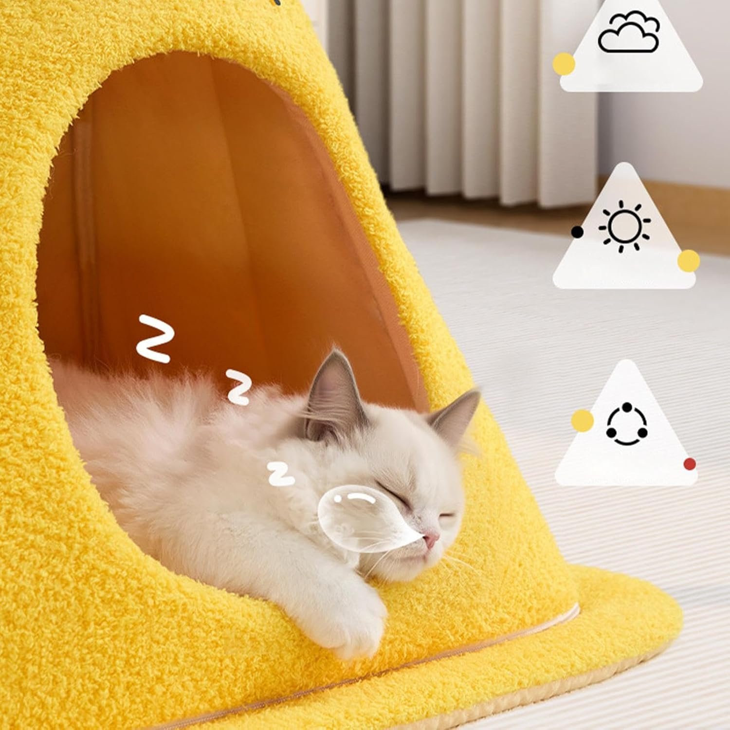 安眠できる落ち着いた空間: 特殊なテント型構造が閉塞感なく安心感を与え、冷たい隙間風を遮断しながら体温を保つ。 気温が下がる日や温度変化のある部屋でも愛猫が一時休息でき、快適さと保護されたという感覚の両方を提供します。