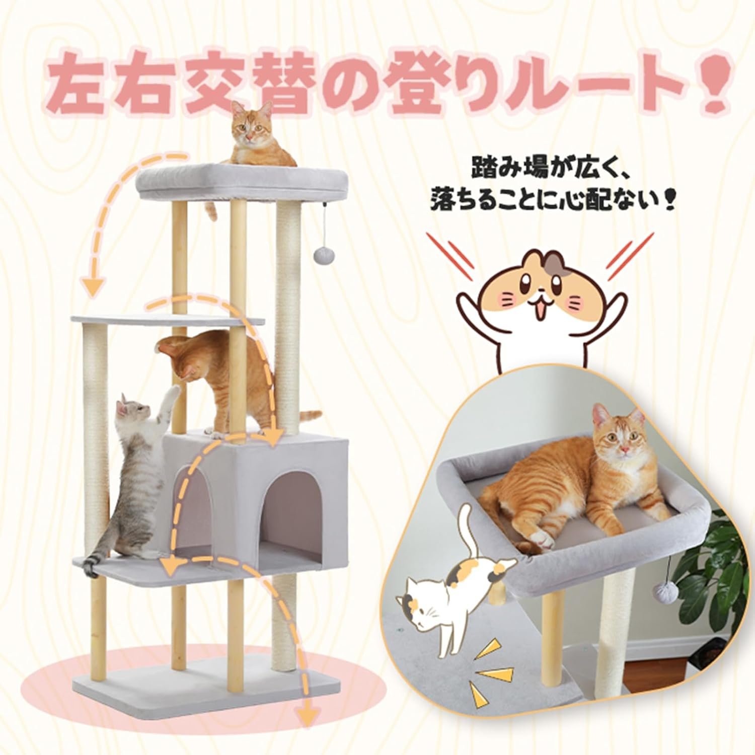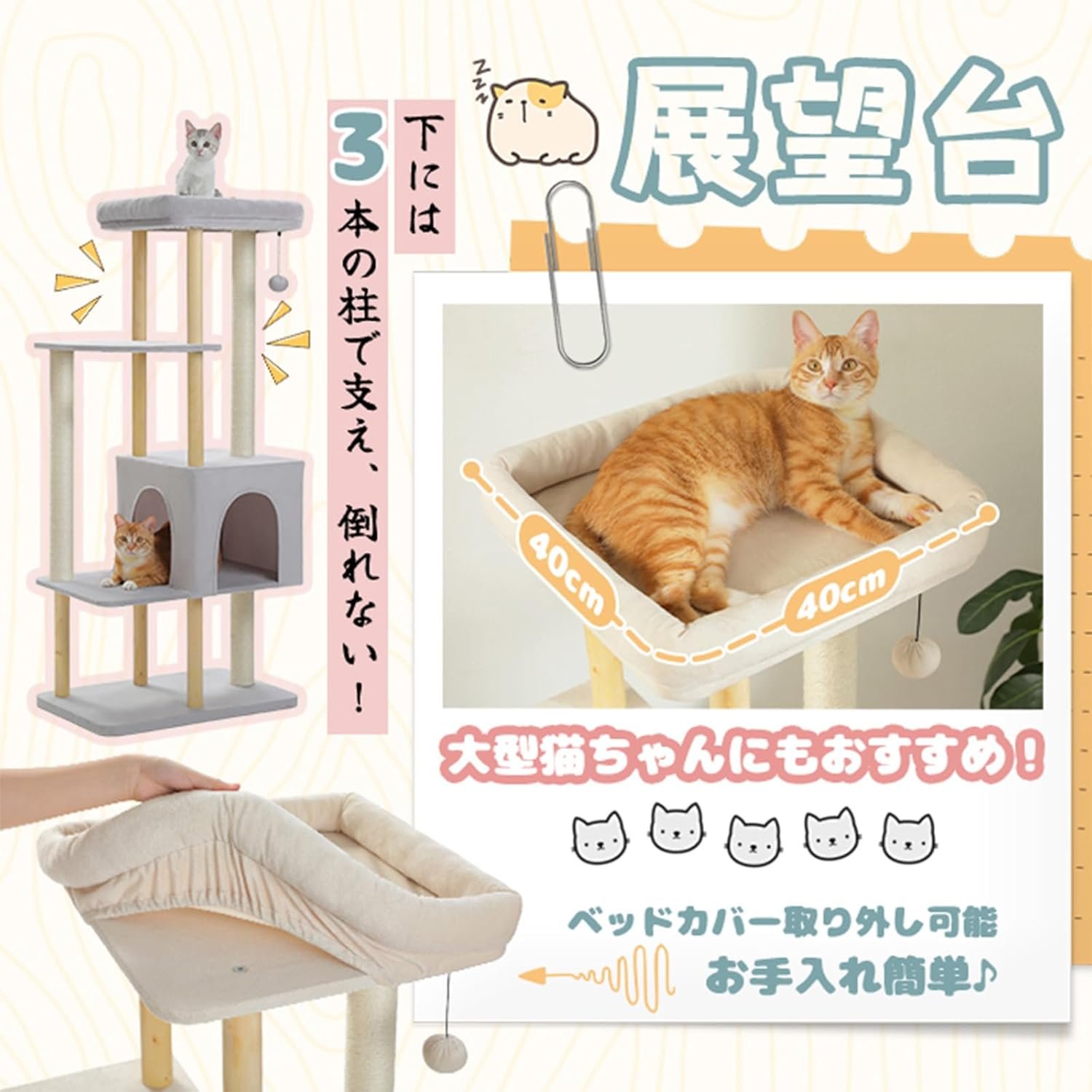 製品仕様:幅23.6 x深さ15.7 x高さ53.1インチ(60 x 40 x 135 cm);重量:33.1(厚くて広いベース)ベースの厚さは0.9インチ(2.4 cm)なので、優れた安定性を持っています。重心は低いので、簡単に落ちることはありません。 3つの柱でサポートされているスタンドの表示:3つの柱の安定性が高く、壊れることなく長持ちします。 15.7 x 15.7インチ(40 x 40 cm)。そのため、大きな猫でさえ快適にリラックスできます。カバーを取り外すことができるので、いつでも清潔に保つことができます。丸い角:角は丸くなっているので、誤ってぶつかることを心配する必要はありません。おもちゃが含まれています:お子様の遊び心を高めるためにおもちゃが付属するボールが付属しています。また、余分なおもちゃが付属しています。店で別々に購入できます。