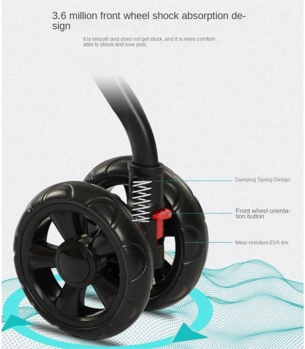 4つの柔軟なセーフホイール:360度回転できる2つのユニバーサルフロントホイールを装備し、2つのロック可能なリアホイールをセーフティブレーキで装備し、犬のベビーカーは簡単にロックされます。