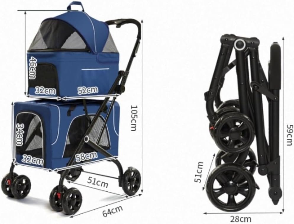 便利な折りたたみデザイン:このペットベビーカーは、コンパクトストレージのために簡単に折りたたむことができ、旅行や毎日の使用に最適です。車のトランクやストレージスペースに収まるようにすばやく折りたたむ