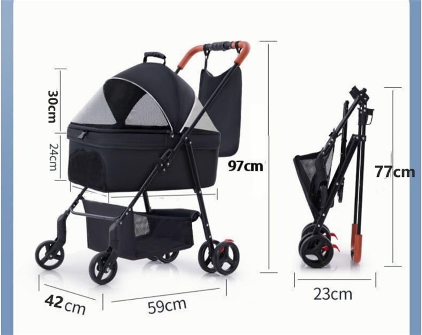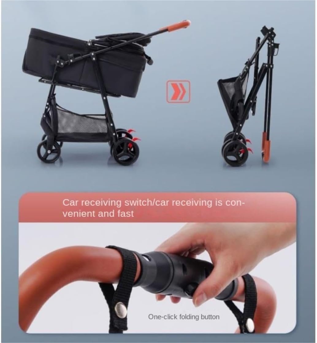 便利な折りたたみデザイン:このペットベビーカーは、コンパクトストレージのために簡単に折りたたむことができ、旅行や毎日の使用に最適です。車のトランクやストレージスペースに収まるようにすばやく折りたたむ