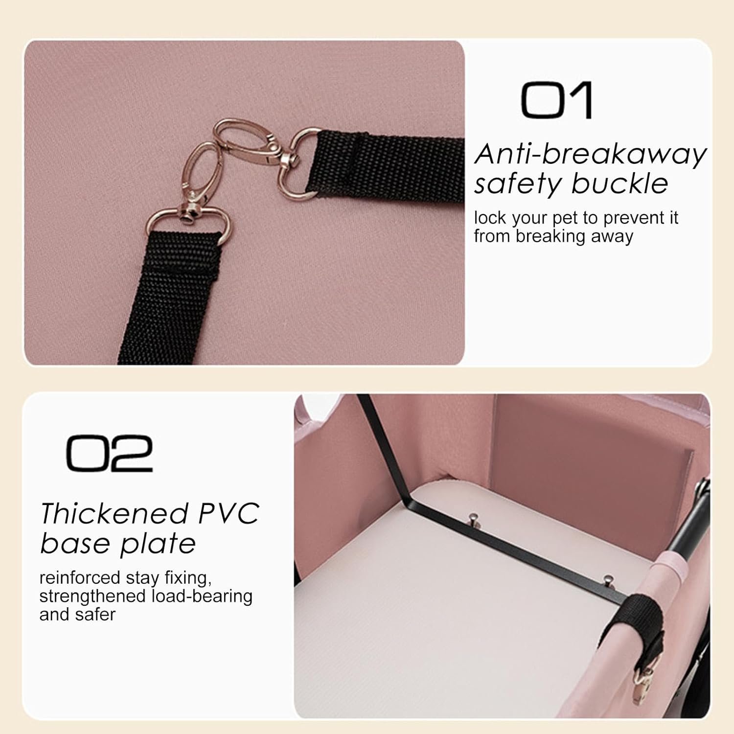 【頑丈な構造】安全対策が自慢の犬用ベビーカーは、強化されたステー、壊れにくい安全バックル、保護を保証する厚いPVCベースプレートを備えています。頑丈な構造と強化された耐荷重により、ペットが逃げるのを防ぎ、屋外での旅行でも長持ちします。