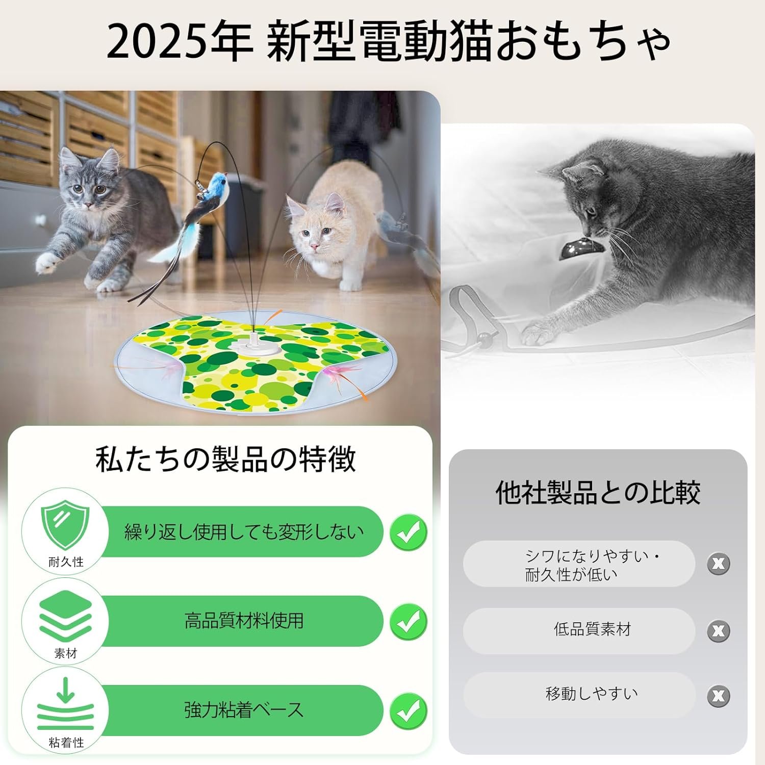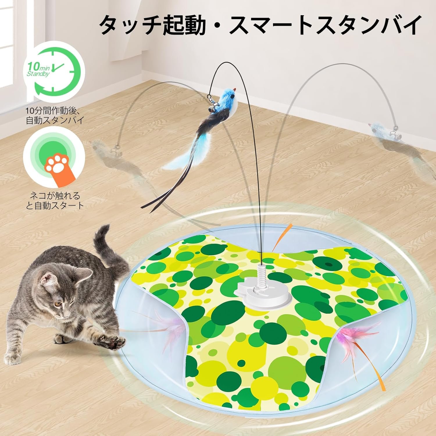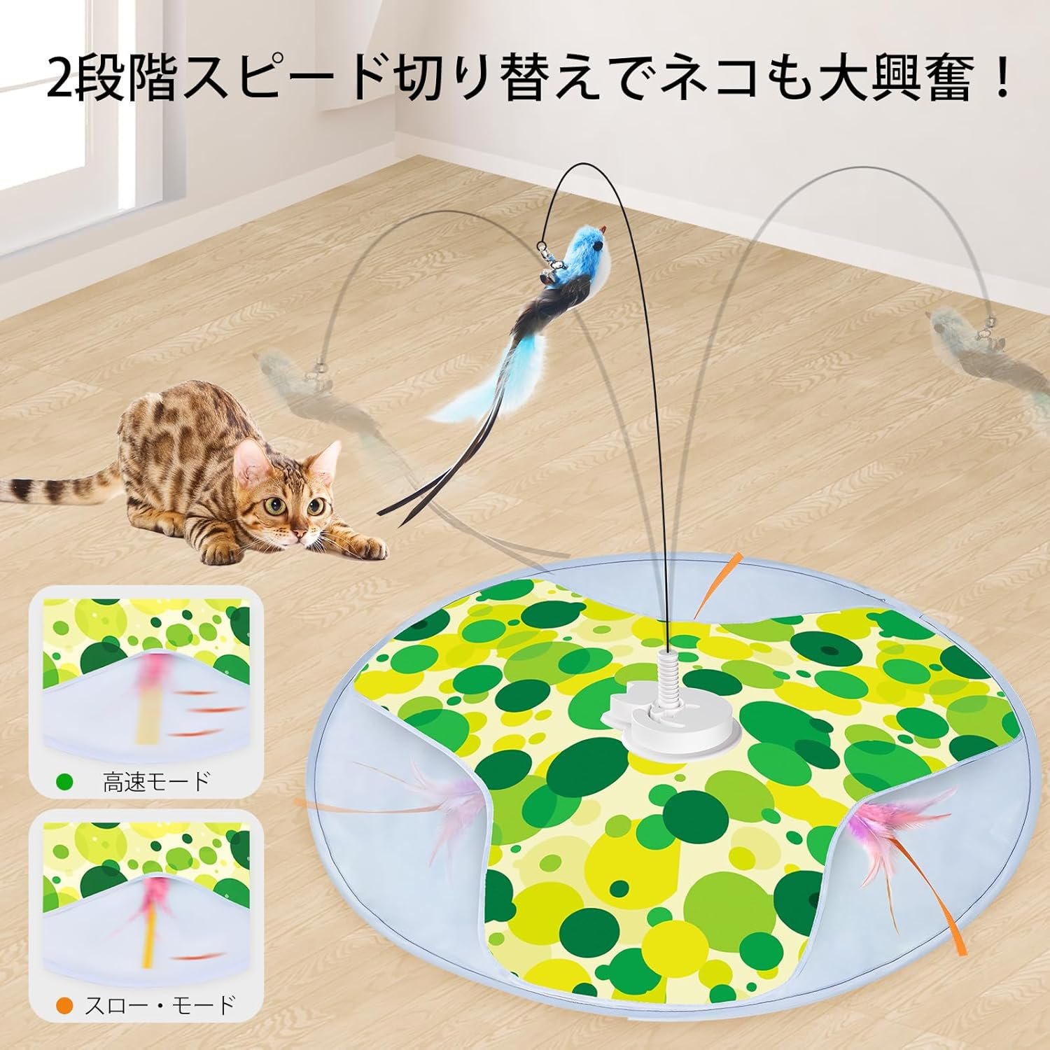 【2速であなたの子猫の気分に合わせて選択するcompuringボタンを押すだけで、通常(緑色のランプ)とランダム(オレンジ色のランプ)の間の速度を変更します。自動猫のおもちゃには取り外し可能なカバーが付いています。猫が隠れて探しているのにうんざりしているときは、羽や鳥を追いかけるためにカバーを取り除くことができます。複数の人やさまざまなプレイ方法に最適です