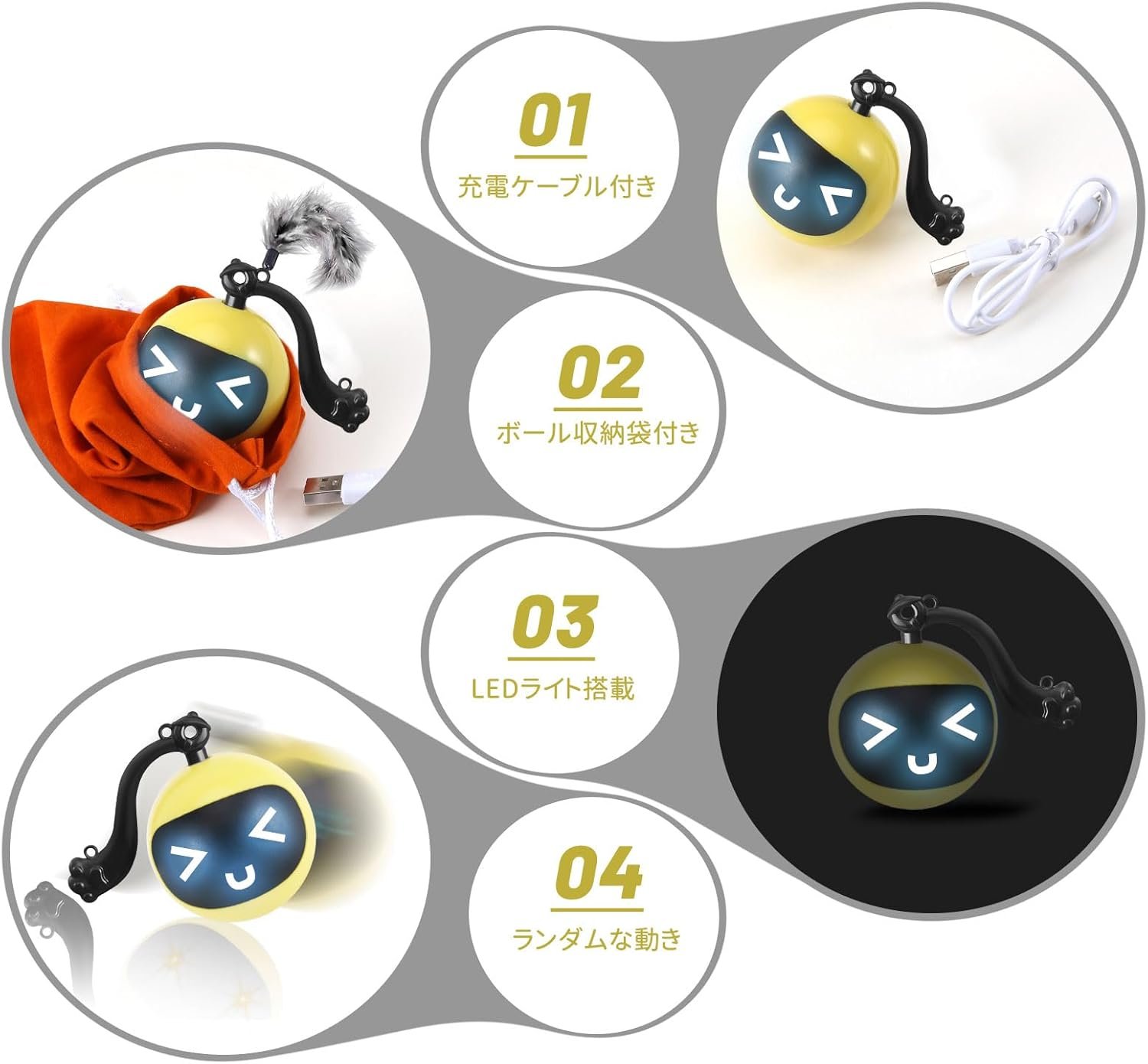 電気玩具猫ボール:私たちの電気猫のボールにはスマートな機能があります。アクティブになるたびに、ボールは30秒間ランダムに転がり、その後停止します。しかし、猫がボールに触れたりぶつかったりすると、再び転がり始めます。このスマートなデザインは、猫の注意と応答性を高めます。さらに、収納袋が付いているので、使用していないときにボールを保管してスペースを清潔に保つことができます